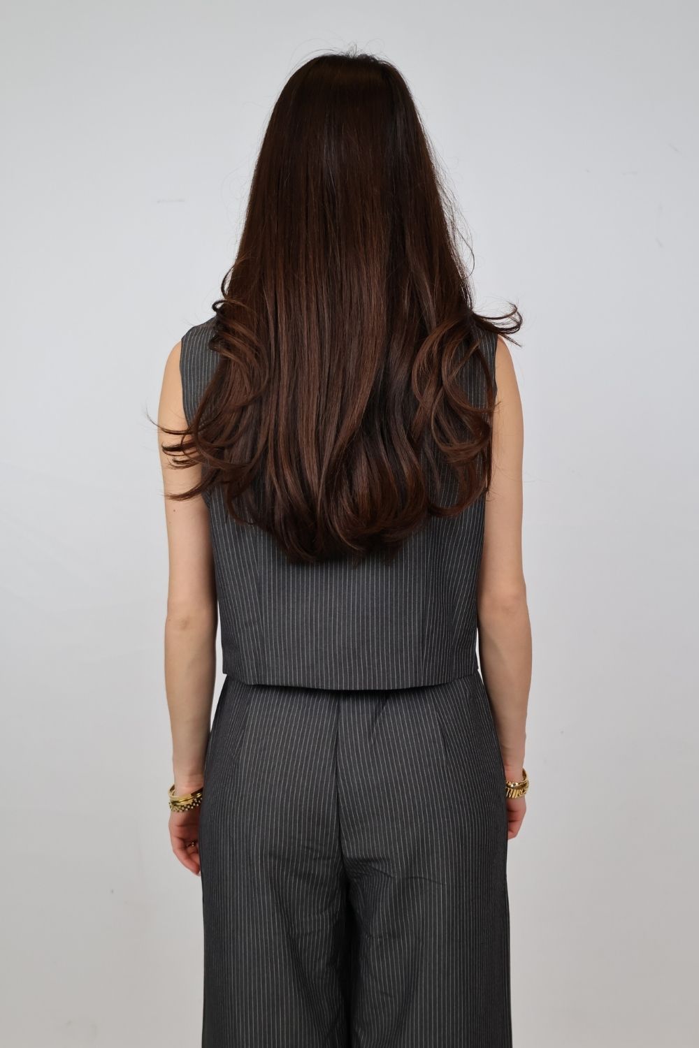 Power look incoming! Deze donkergrijze gestreepte gilet met subtiele witte lijntjes is jouw secret weapon voor een classy & confident outfit. Draag βm solo met een crop top of combineer βm als matching set met onze bijpassende pantalon voor de ultieme boss babe vibes. πΌβ¨