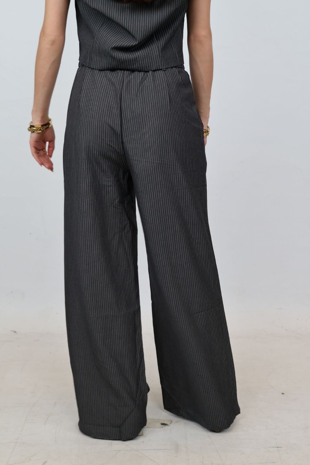 Say hello to je nieuwe favoriete pantalon! Deze donkergrijze gestreepte broek met subtiele witte lijnen is dé perfecte mix van classy & comfy. De elastische band zorgt voor een mooie, aangesloten fit bij de taille, terwijl de rits en riemlussen aan de voorkant nét dat extra beetje polish geven. ✨