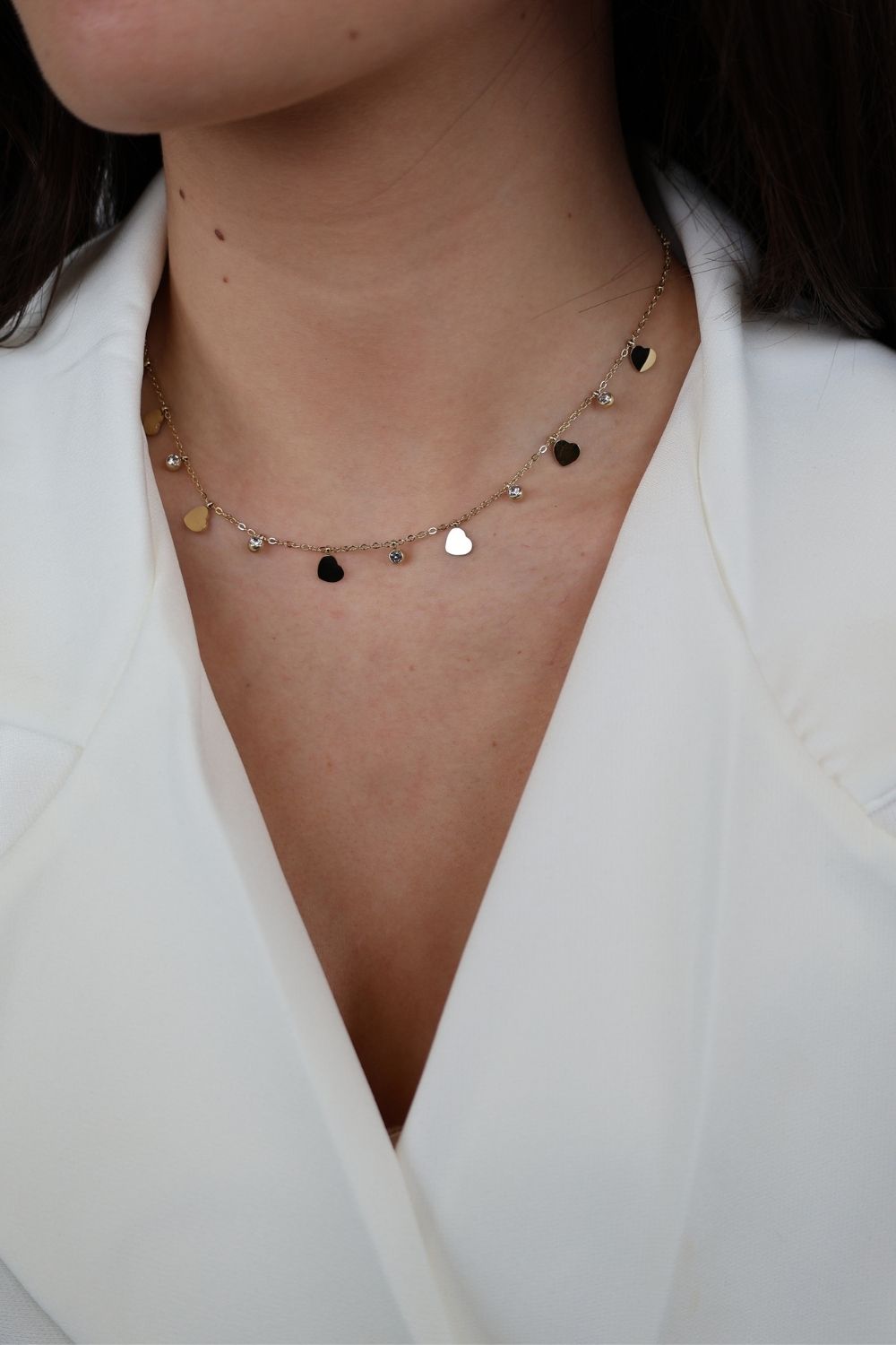 Sweetness overload π« De Little Hearts & Charm ketting in goud is een fijne, speelse combinatie van mini hartjes en subtiele steentjes die fonkelen bij elke beweging. Deze ketting brengt een perfecte balans tussen schattig en chique β ideaal om je dagelijkse outfit een sprankelend accent te geven. Gemaakt van roestvrij staal, dus kleurvast en ready om lang van te genieten. Een echte must-have voor liefhebbers van delicate details!