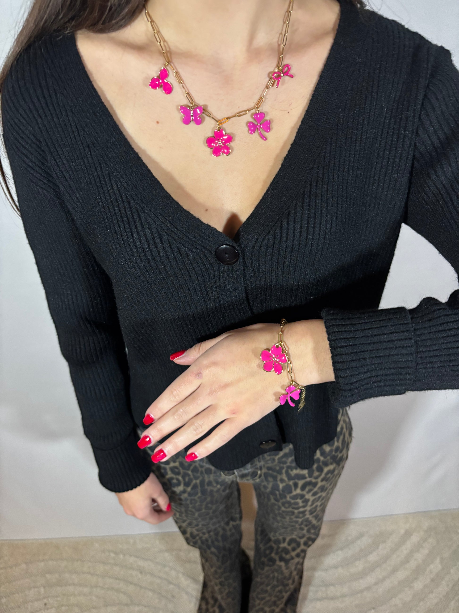 Voeg een vleugje kleur en elegantie toe aan je look met deze schakelketting met roze bedels. Het verfijnde schakeldesign wordt gecombineerd met charmante roze bedels, wat zorgt voor een speelse en toch verfijnde uitstraling. Perfect voor zowel dagelijkse outfits als speciale gelegenheden.