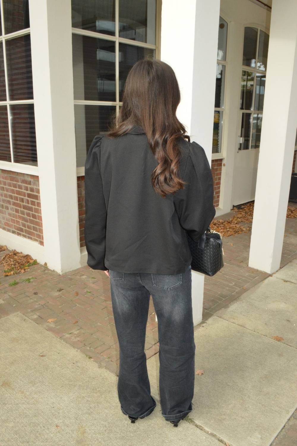 Een moderne korte blazer jas in diepzwart met een subtiel oversized pasvorm. De pofmouwen en enkele knoopsluiting zorgen voor een eigentijdse, elegante look die moeiteloos combineert met zowel casual als chique outfits.
